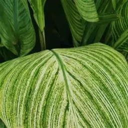 金脉美人蕉叶片淡黄色,叶脉绿化,叶缘具红边,全缘,大花美人蕉之变种