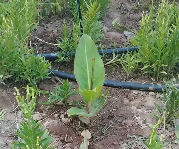 美人蕉植株全部绿色,高可达1.5米。叶片卵状长圆形,长10-30厘米,宽达10厘米。