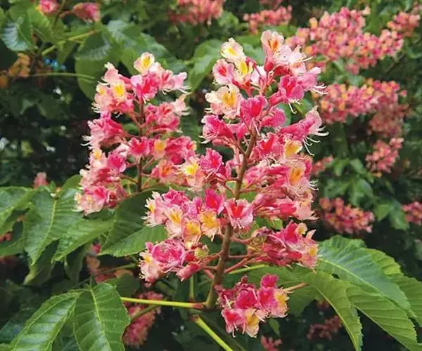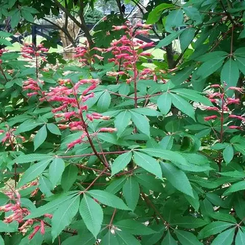 红花七叶树(学名:Aesculus × carnea Zeyh.)是七叶树科七叶树属植物,落叶乔木。树高可达15-20米,树冠伞形,干形挺拔。小枝粗壮,栗褐色,光滑无毛。掌状复叶小叶通常5枚,成树5-7枚,无柄,叶片倒卵形至长椭圆形,边缘有不规则重锯齿。花期5-6月,花小为粉红色至深红色,花时红色硕大的顶生圆锥花序竖于叶簇中,似一个华丽的大烛台,缀满树冠。果球形或倒卵形,于9月下旬至10月中下旬成熟。