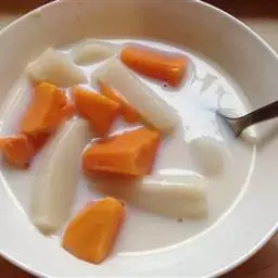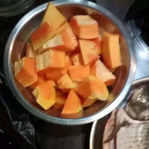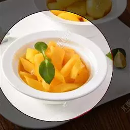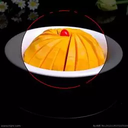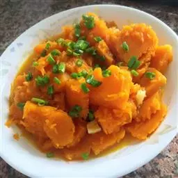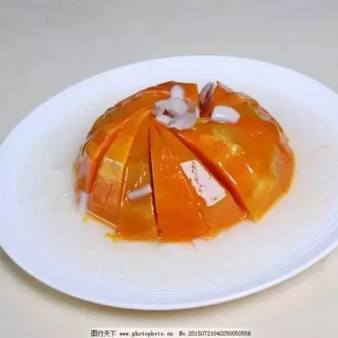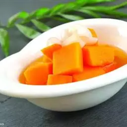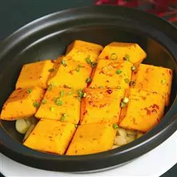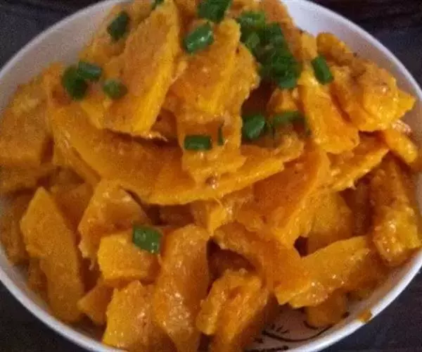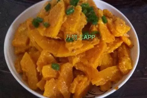 一南瓜切成五六厘米的薄片,放在微波炉内高火,时间视南瓜的多少而定,直到南瓜八九分熟