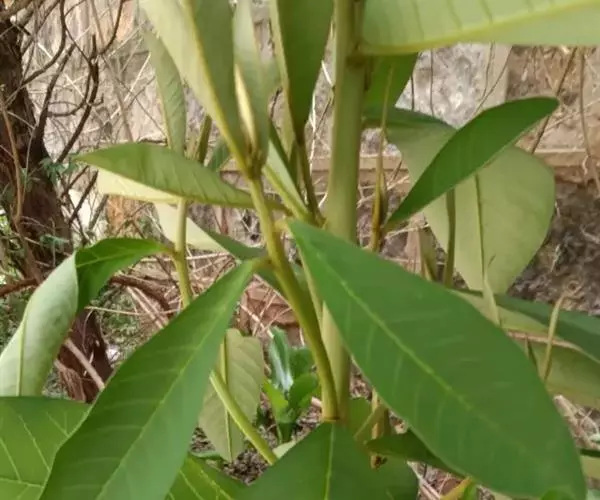 托叶细小,线形,贴伏于叶柄两旁;单叶,叶片质薄,倒披针形或长椭圆形,先端钝圆,具细小短尖,基部楔形,长5-15厘米,宽2-4厘米,上面无毛,下面被锈色短柔毛;叶柄长2-3毫米。