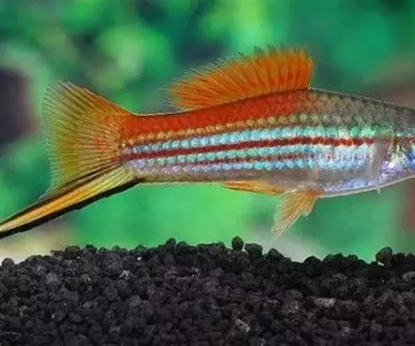 成鱼体长可达10厘米,通体橄榄色,鳞片边缘褐色,两侧中部有一条深红色条纹,从鳃后直至尾部,条纹上下有浅蓝色镶边。雄鱼尾鳍下端延长似剑,其长度超过体长,剑尾绿色或橙色,边缘黑色,背鳍上有红斑。雌鱼色泽较雄鱼逊色,无剑尾。