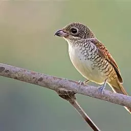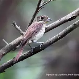 虎纹伯劳:全长165毫米左右。雄性成鸟:额基、眼先和宽阔的贯眼纹黑色;前额、头顶至后颈蓝灰色;上体余部包括肩羽及翅上覆羽栗红褐色,杂以黑色波状横斑;飞羽暗褐色,外翻具棕褐色羽缘;尾羽棕褐色,具不明显的褐色横斑,外侧尾羽端缘棕白色;下体纯白色,两胁略沾蓝灰色;覆腿羽白杂以黑斑。雌性成鸟羽色与雄鸟相似,但前额基部黑色较小,眼先及过眼黑纹沾褐,头顶灰色及背羽的栗褐色均不如雄鸟鲜艳;胁部缀以黑褐色鳞状横斑。一般栖息于树林、分布自平原至丘陵、山地,喜栖于疏林边缘以及巢址选在带荆棘的灌木及洋槐等阔叶树。性格凶猛,常停栖在固定场所,寻觅和抓捕猎物。主要食物是昆虫,特别是蝗虫、蟋蟀、甲虫、臭虫、蝴蝶和飞蛾,也吃小鸟和蜥蜴。分布于亚洲多国,该物种的模式产地在印度尼西亚爪哇。