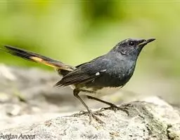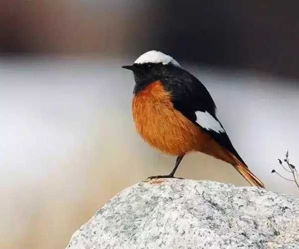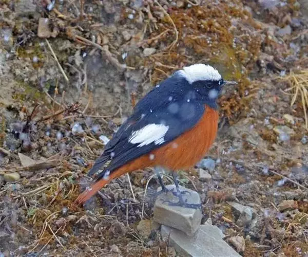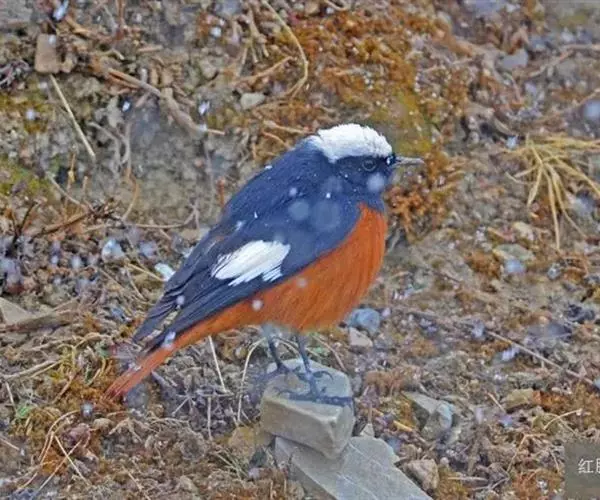红腹红尾鸲(学名:Phoenicurus erythrogastrus)是鹟科、红尾鸲属小型鸟类,体长16-19厘米。个体较其他红尾鸲稍大。雄鸟头顶至枕白色,额、头侧、背、肩、翅、颏、喉和胸黑色,翅上有大型白斑,在黑色翅、背的衬托下极为醒目,其余上下体羽色,包括尾和尾上尾下覆羽概为锈棕色。雌鸟烟灰褐色,腰至尾上覆羽和尾羽棕色,眼有一圈白色。下体浅棕灰色。特征均很显著,野外不难识别。