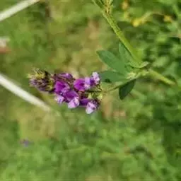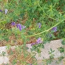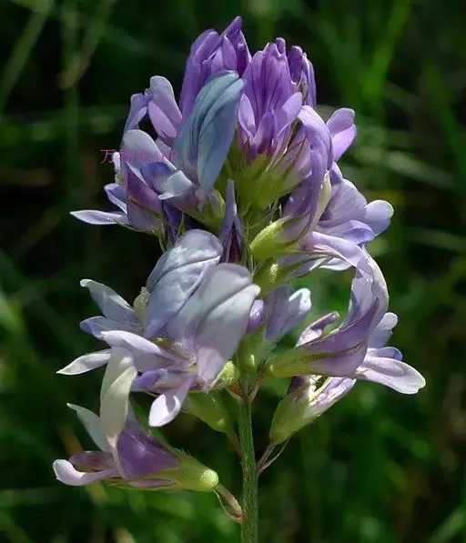 紫苜蓿(拉丁学名:Medicago sativa L.),是豆科苜蓿属植物。多年生草本,多分枝,高30-100厘米。叶具3小叶;小叶倒卵形或倒披针形,长1-2厘米,宽约0.5厘米,先端圆,中肋稍突出,上部叶缘有锯齿,两面有白色长柔毛;小叶柄长约1毫米,有毛;托叶披针形,先端尖,有柔毛,长约5毫米。总状花序腋生;花萼有柔毛,萼齿狭披针形,急尖;花冠紫色,长于花萼。荚果螺旋形,有疏毛,先端有喙,有种子数粒;种子肾形,黄褐色。 在中国为栽培植物;现在世界各国都有栽种。为优良饲料植物;又可作绿肥;种子含油10%左右。