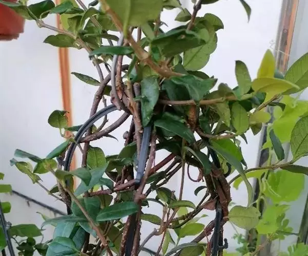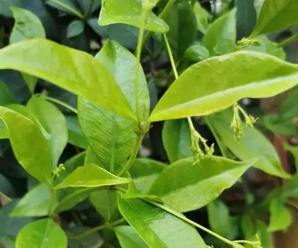 常绿木质藤本,长达10米,具乳汁;茎赤褐色,圆柱形,有皮孔;小枝被黄色柔毛,老时渐无毛。叶革质或近革质,椭圆形至卵状椭圆形或宽倒卵形,长2-10厘米,宽1-4.5厘米,顶端锐尖至渐尖或钝,有时微凹或有小凸尖,基部渐狭至钝,叶面无毛,叶背被疏短柔毛,老渐无毛;叶面中脉微凹,侧脉扁平,叶背中脉凸起,侧脉每边6-12条,扁平或稍凸起;叶柄短,被短柔毛,老渐无毛;叶柄内和叶腋外腺体钻形,长约1毫米。