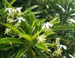 二歧聚伞花序腋生或顶生,花多朵组成圆锥状,与叶等长或较长;花白色,芳香;总花梗长2-5厘米,被柔毛,老时渐无毛;苞片及小苞片狭披针形,长1-2毫米;花萼5深裂,裂片线状披针形,顶部反卷,长2-5毫米,外面被有长柔毛及缘毛,内面无毛,基部具10枚鳞片状腺体;花蕾顶端钝,花冠筒圆筒形,中部膨大,外面无毛,内面在喉部及雄蕊着生处被短柔毛,长5-10毫米,花冠裂片长5-10毫米,无毛;雄蕊着生在花冠筒中部,腹部粘生在柱头上,花药箭头状,基部具耳,隐藏在花喉内;花盘环状5裂与子房等长;子房由2个离生心皮组成,无毛,花柱圆柱状,柱头卵圆形,顶端全缘;每心皮有胚珠多颗,着生于2个并生的侧膜胎座上。