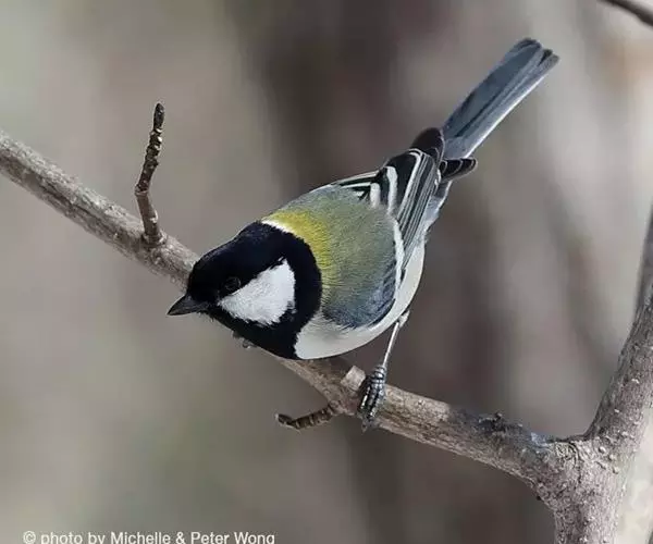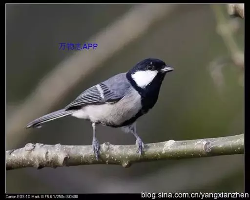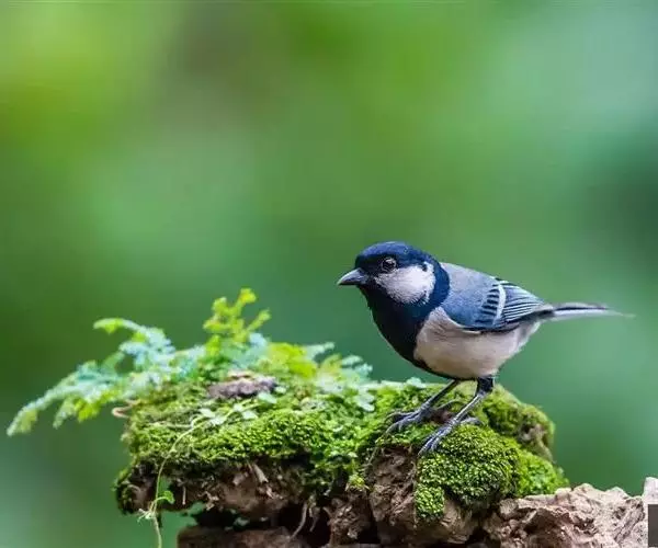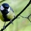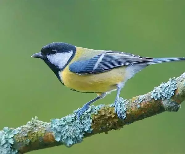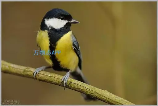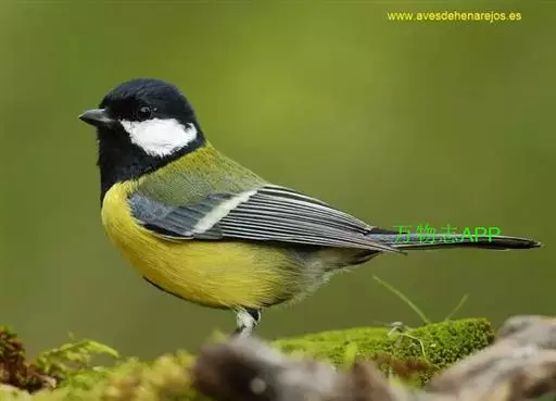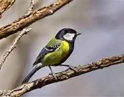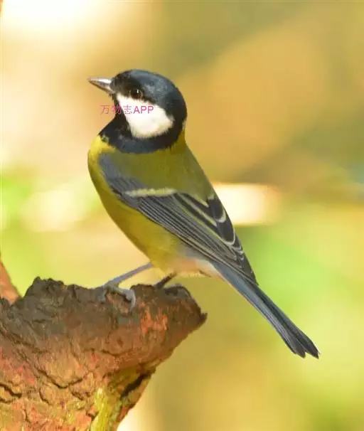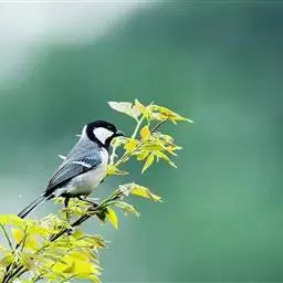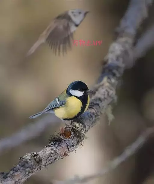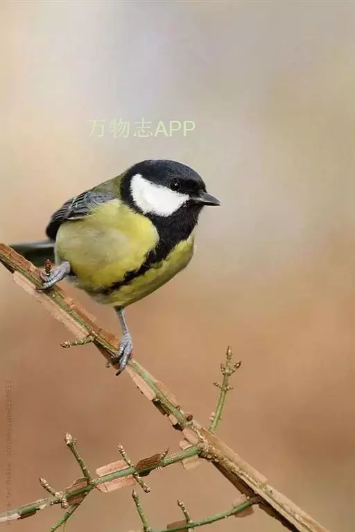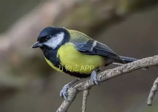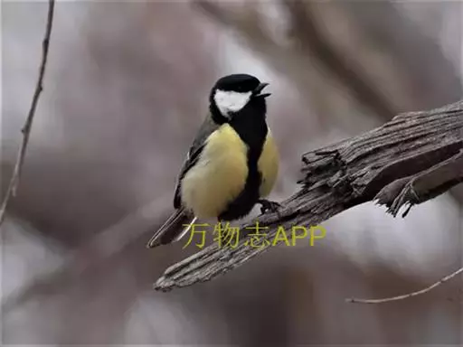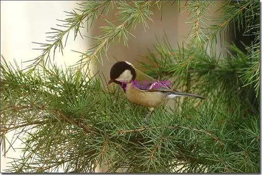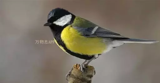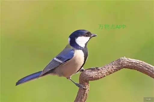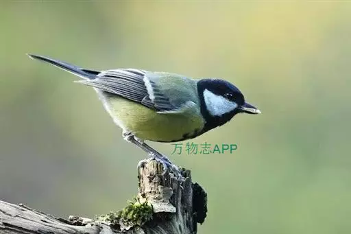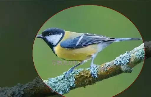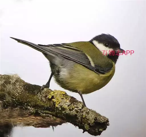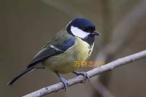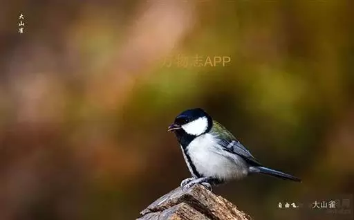 大山雀(学名:Parus major):中小型鸟类,体长13-15厘米。整个头呈黑色,头两侧各有一大型白斑,喙呈尖细状,便于捕食。上体为蓝灰色,背沾绿色。下体白色,胸、腹有一条宽阔的中央纵纹与颏、喉黑色相连。