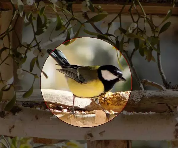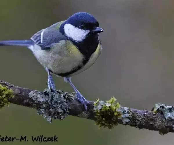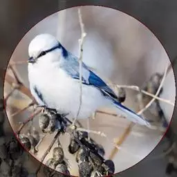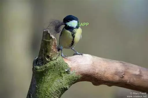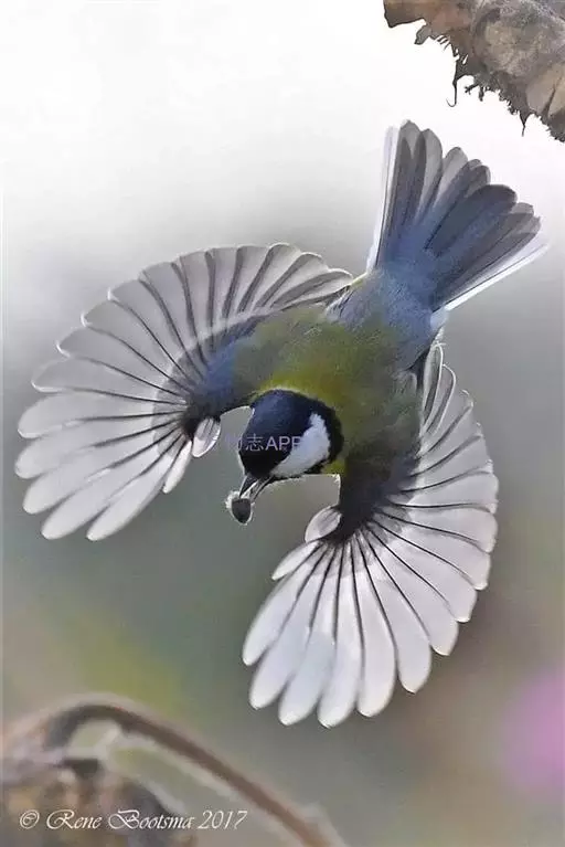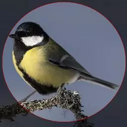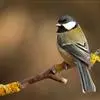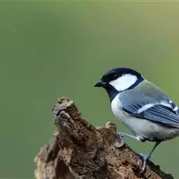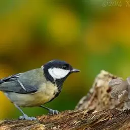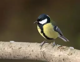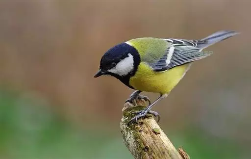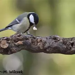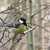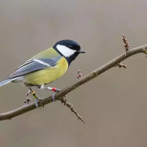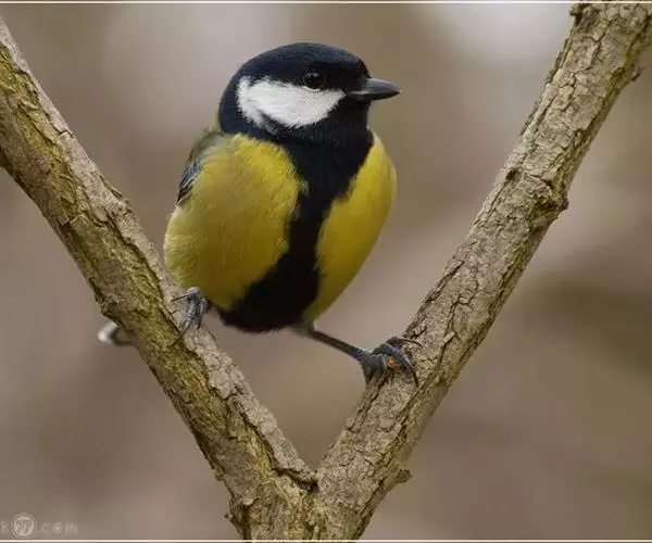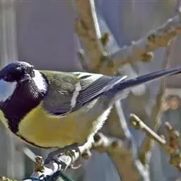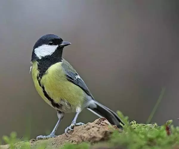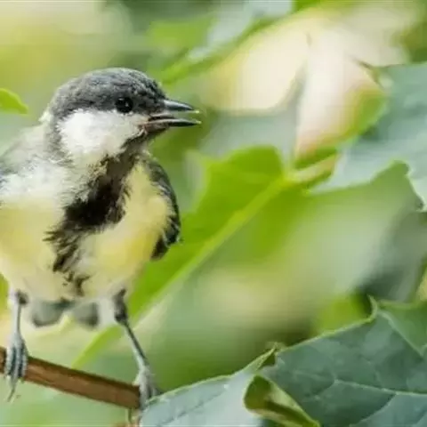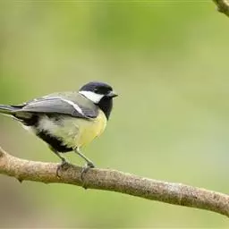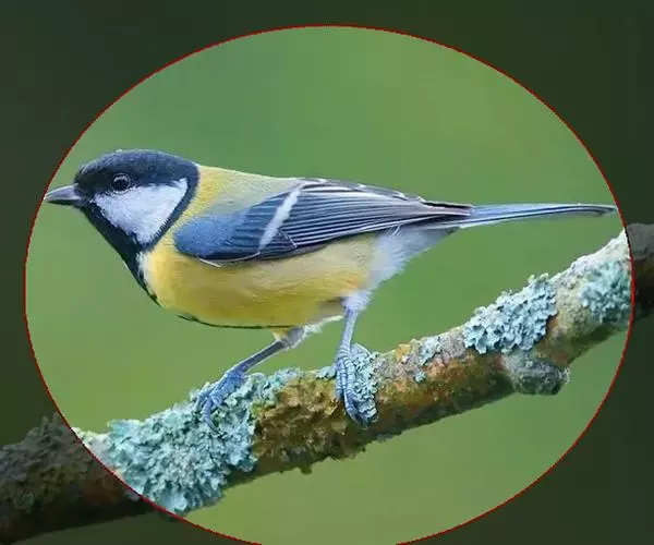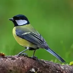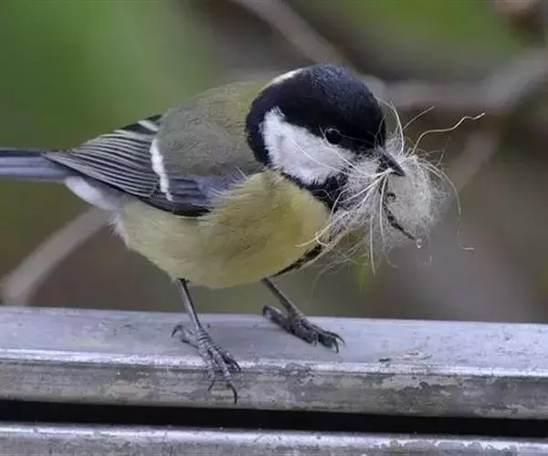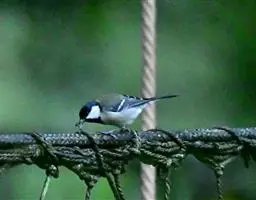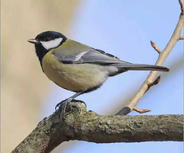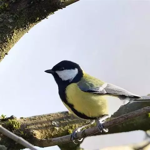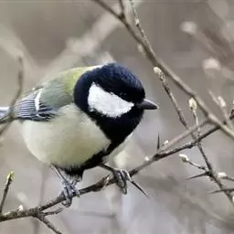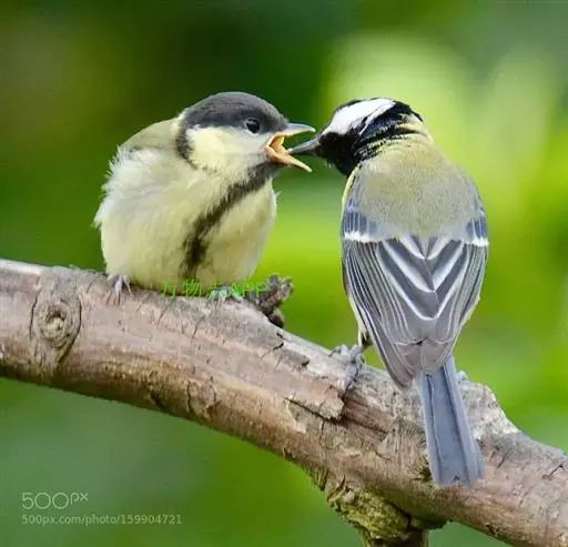大山雀(学名:Parus major):中小型鸟类,体长13-15厘米。整个头呈黑色,头两侧各有一大型白斑,喙呈尖细状,便于捕食。上体为蓝灰色,背沾绿色。下体白色,胸、腹有一条宽阔的中央纵纹与颏、喉黑色相连。