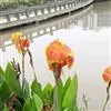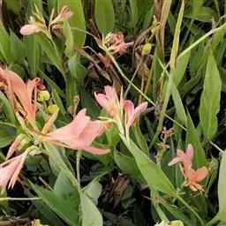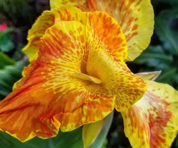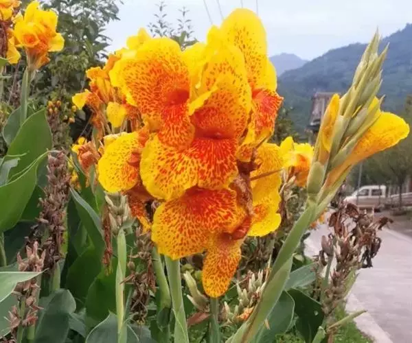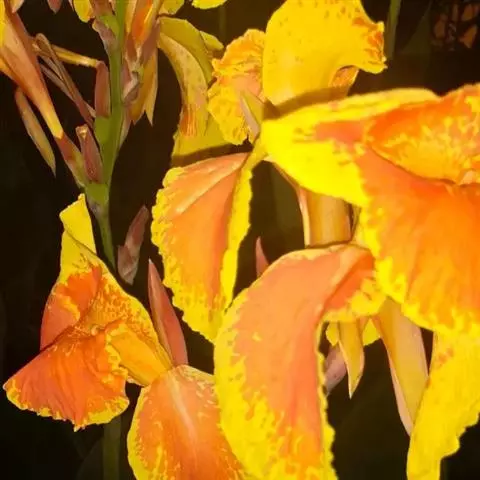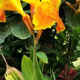 兰花美人蕉(学名:Canna orchioides Bailey):是多年生球根草本植物。株高1-1.5米;茎绿色。叶片椭圆形至椭圆状披针形。总状花序通常不分枝;花大,直径10-15厘米;花冠裂片披针形,鲜黄至深红,具红色条纹或溅点,无纯白或粉红色;花期:夏、秋。为园庭观赏植物。
