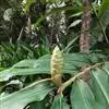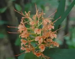 穗状花序顶生,椭圆形,长10-20厘米,宽4-8厘米;苞片呈覆瓦状排列,卵圆形,长4.5-5厘米,宽2.5-4厘米,每一苞片内有花2-3朵;花芬芳,白色,花萼管长约4厘米,顶端一侧开裂;花冠管纤细,长8厘米,裂片披针形,长约5厘米,后方的1枚呈兜状,顶端具小尖头;侧生退化雄蕊长圆状披针形,长约5厘米;唇瓣倒心形,长和宽约6厘米,白色,基部稍黄,顶端2裂;花丝长约3厘米,花药室长1.5厘米;子房被绢毛。