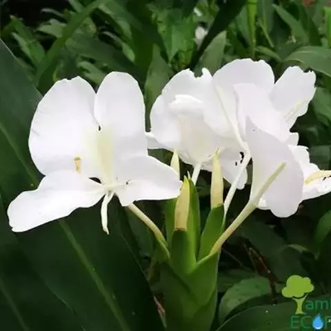 姜花象征纯朴。它一枝挺拔,一个花苞开出五、六朵洁白泛黄的花儿,每朵有三片花瓣,宛如翩翩白蝶,聚集于翡翠簪头,从朝到暮,喷放清香。故欧美把姜花称作“蝴蝶百合”。