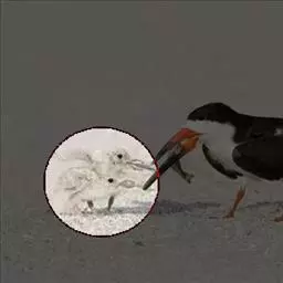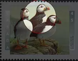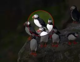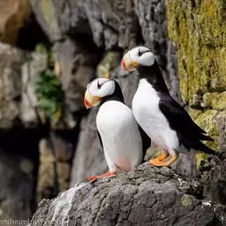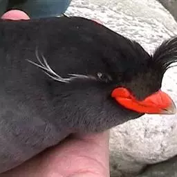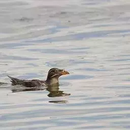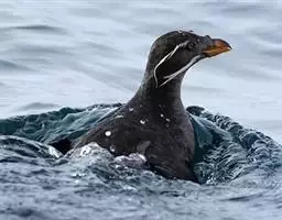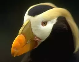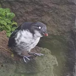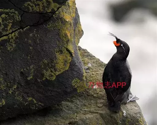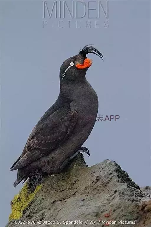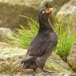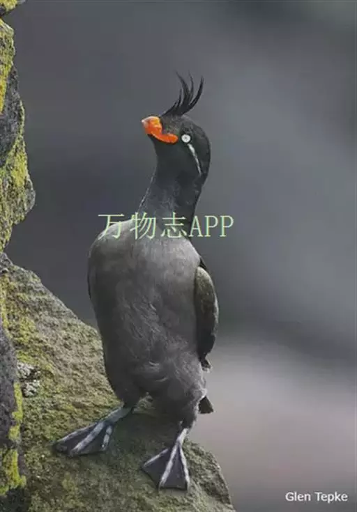 凤头海雀(学名:Aethia cristatella ):体重211-322克,体长18-20厘米,是鸻形目海雀科的一种海鸟,前趾间有蹼膜,后趾缺如。翅窄而短小,尾短。是海鸟中体型相对较小的鸟类。雌雄羽色相似。身体羽毛上体深灰色,下体通常是棕灰色。头顶面部有装饰性的向前卷曲的羽冠,雄鸟鸟喙上有颜色鲜艳的“角质”板,称为鼻板。虹膜白色,头的两侧各有一条白色羽纹,从眼睛后面一直延伸到耳朵。腿灰色,脚上有蹼呈煤黑色。鸟喙亮红橙色,尖端是黄色。