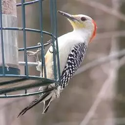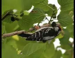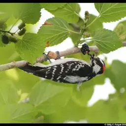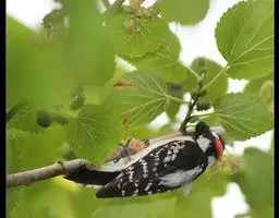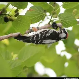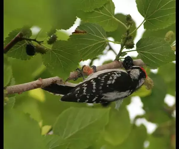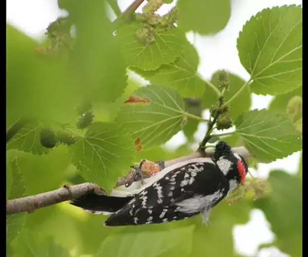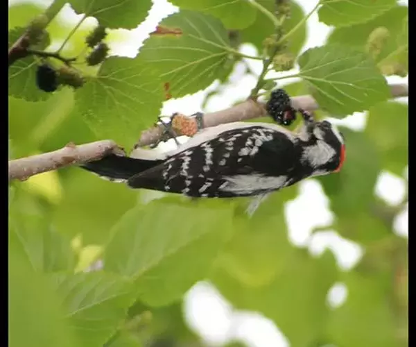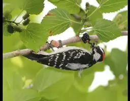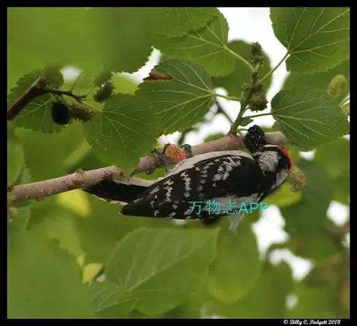 绒啄木鸟,北美洲最小的啄木鸟,白腹黑背和黑项,黑翼上有白色斑点。头部有黑白相间的条纹,尾巴短小,雄鸟的头部有红色羽毛。绒啄木鸟原是阿拉斯加的居民,现分布加拿大和南部遍及美国的西南。 首选的栖所包括森林地、公园和庭院。