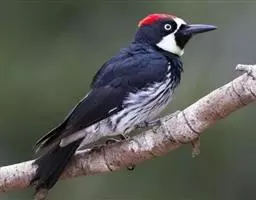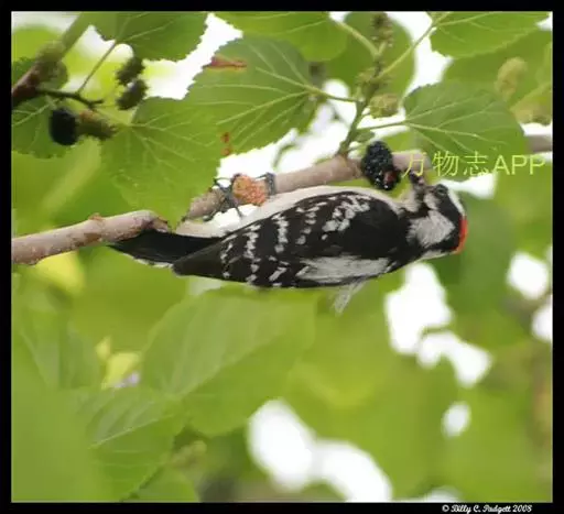 绒啄木鸟,北美洲最小的啄木鸟,白腹黑背和黑项,黑翼上有白色斑点。头部有黑白相间的条纹,尾巴短小,雄…