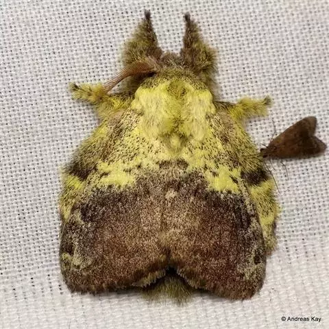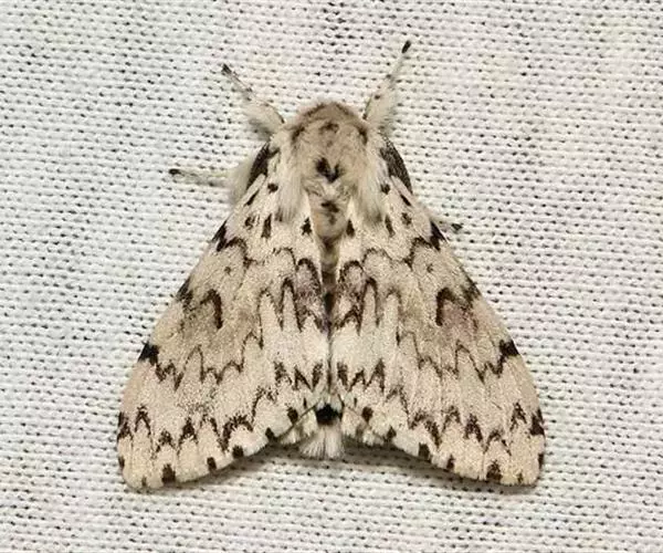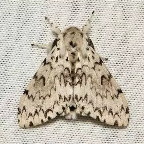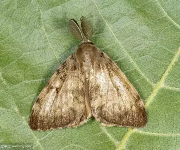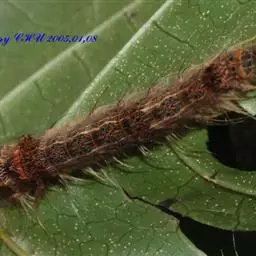 成虫雌雄异型. 雄成虫:体长约20毫米,前翅茶褐色,有4、5条波状横带,外缘呈深色带状,中室中央有一黑点。 雌虫:体长约25毫米,前翅灰白色,每两条脉纹间有一个黑褐色斑点。腹末有黄褐色毛丛。卵:圆形稍扁,直径1.3毫米,初产为杏黄色,数百粒至上千粒产在一起成卵块,其上覆盖有很厚的黄褐色绒毛。幼虫:老熟时体长50-70毫米,头黄褐色有八字形黑色纹。前胸至腹部第二节的毛瘤为蓝色,腹部第三-九节的7对毛瘤为红色。蛹:体长19~34mm,雌蛹大,雄蛹小。体色红褐或黑褐色,被有锈黄色毛丛。