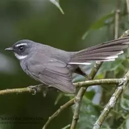 白眉扇尾鹟:体长17厘米,是一种中等体型的灰色扇尾鹟。色彩独特。宽宽的眉纹及前额白色,尾有白色宽边…