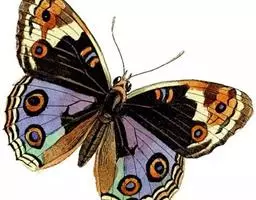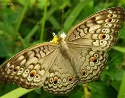 孔雀蛱蝶展翅宽50~60mm。翅膀表面红色,上、下翅有一大型彩色眼纹;翅膀腹面淡褐色,拟似烟熏枯叶…