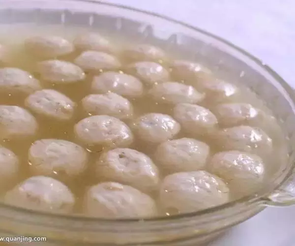 步骤:将鱼 清汤鱼丸 丸在沸水中氽一下。另用砂锅将鸡汤煮沸,将鱼丸放入,加精盐,味精和豆苗。熟笋片,香菇沸水略氽后在鱼丸上间隔摆放香菇结顶,四周以豆苗衬托,淋上鸡油即可。