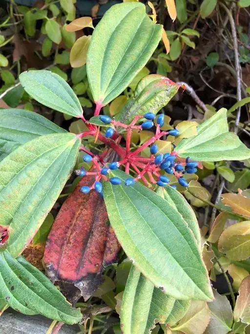 果实先红色后变蓝黑色,卵圆形,长约5毫米;核卵圆形,扁,长约4毫米;直径3.5-4毫米,有1条浅腹沟和2条浅背沟。花期6-10月,果熟期10-12月。