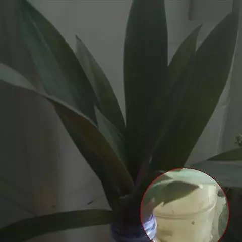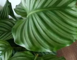 叶基生或茎生,叶片呈长椭圆形,长25-30厘米,宽8-15厘米。主脉两侧有白色带与暗绿色带交互成羽状排列,色彩对比鲜明。