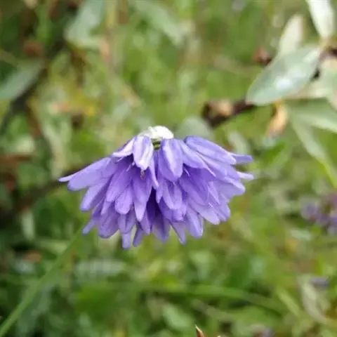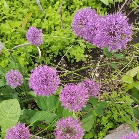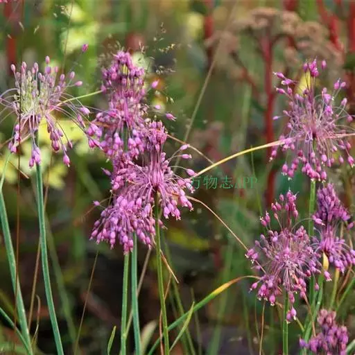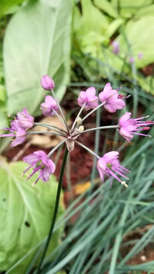 花葶侧生,圆柱状,高20-40厘米,下部被叶鞘;总苞2裂,比伞形花序短;伞形花序近半球状,较松散;小花梗近等长,比花被片长1-4倍,基部具小苞片;花淡紫色至暗紫色;花被片宽椭圆形至近圆形,顶端钝圆,长4-6毫米,宽3-4毫米,内轮的稍长;花丝等长,约为花被片长的1.5倍,仅基部合生并与花被片贴生,内轮的基部扩大,扩大部分每侧各具1齿,外轮的无齿,锥形;子房倒卵球状,腹缝线基部具有帘的凹陷蜜穴;花柱伸出花被外。花果期为10-11月。