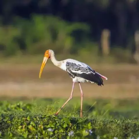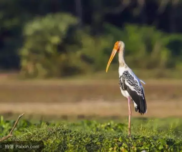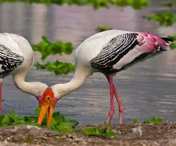 白头鹮鹳(学名:Mycteria leucocephalus),又叫彩鹳,为鹳形目鹳科鹮鹳属的鸟类。羽色美丽,姿态优美,体长93-102厘米,体重2-3.5千克,寿命最高可达28年以上。橙黄色的嘴粗而长,但嘴尖稍微向下弯曲。脚为红色,也特别长,胫的下部裸出。橙色的头部赤裸无羽,繁殖期变为红色。体羽主要为黑色和白色,其中飞羽、尾羽为黑色,具有绿色的金属光泽,胸部具有宽阔的黑色胸带,也具有绿色的金属光泽,其余体羽均为白色。虹膜为淡黄色或褐色。