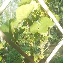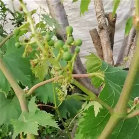 6、合理修枝与疏花疏果 采用单主蔓篱架,每析树留5-6枝,4串果,每串果控制质量在500-700克范围内,亩产量控制在2500公斤范围内。