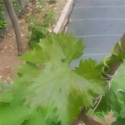 青提葡萄幼嫩新梢上部有紫红色条纹,中下部为绿色;一年生枝浅褐色。梢尖3片幼叶微红色,叶背有稀疏绒毛;成龄叶五裂,上裂刻深,下裂刻浅,叶正背两面均无绒毛,叶片较薄,叶缘锯齿较纯,叶柄红色(或淡红色)。