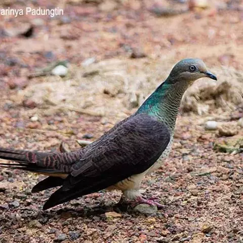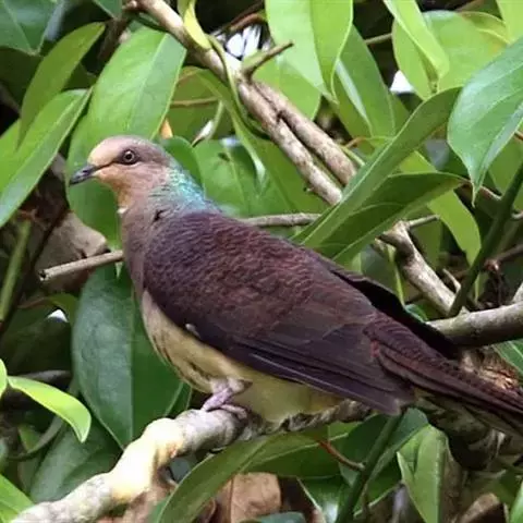 斑尾鹃鸠体长38厘米,是体大而尾长的褐色鹃鸠。背及尾满布黑色或褐色横斑。头灰,颈背呈亮蓝绿色。胸偏粉,…