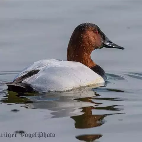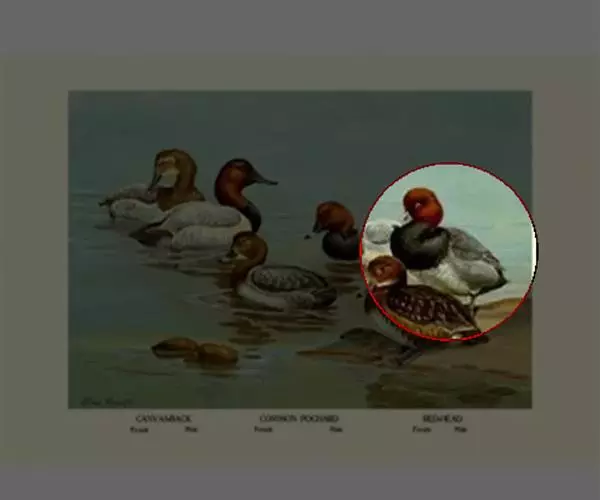 红头潜鸭雄鸟头和上颈栗红色,下颈和胸棕黑色,两肩、下背、翅上三级飞羽、内侧覆羽以及两胁均为淡灰色,缀以黑色波状斑纹。外侧覆羽灰褐色。初级飞羽也为灰褐色,外侧和羽端白色,且杂有黑色波状细斑。腰、尾上和尾下覆羽黑色,尾羽灰褐色。颏有一小白斑。上胸黑色,微具白色羽端,下胸及腹灰色。下腹有不规则的黑色细斑。尾下覆羽和腋羽白色。