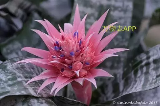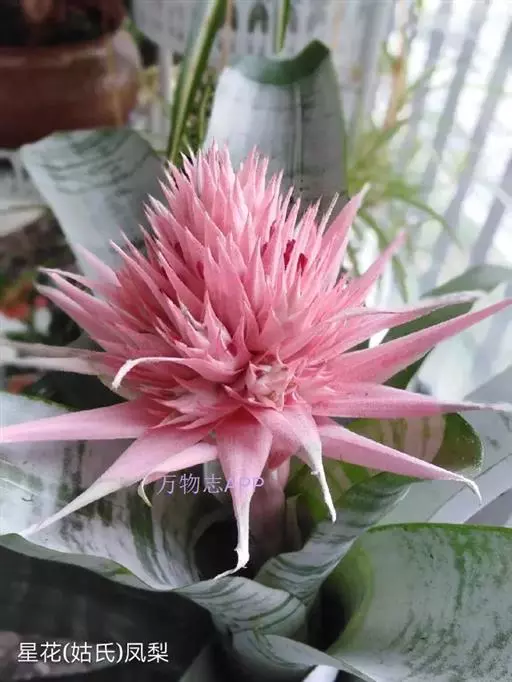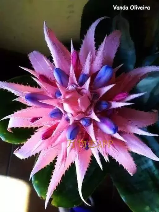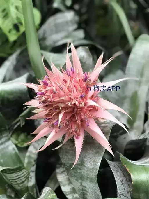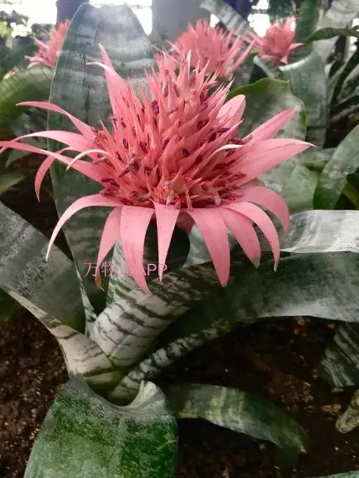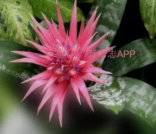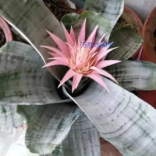 美叶光萼荷(Aechmea fasciata (Lindl.) Baker)凤梨科多年生附生常绿草本植物。莲座状叶丛相互套叠成筒状。叶长达60厘米,革质,被灰色鳞片,绿色,有虎纹状银白色横纹,边缘有黑色小刺。花莛直立,花序穗状,有分枝,花多数。苞片革质,淡红色或深红色。小花无柄,淡蓝色。冬季开花。