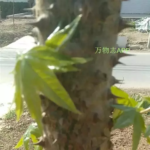 刺楸 刺楸(原变种)落叶乔木,高约10米,最高可达30米,胸径达70厘米以上,树皮暗灰棕色;小枝淡黄棕色或灰棕色,散生粗刺;刺基部宽阔扁平,通常长5-6毫米,基部宽6-7毫米,在茁壮枝上的长达1厘米以上,宽1.5厘米以上。叶片纸质,在长枝上互生,在短枝上簇生,圆形或近圆形,直径9-25厘米,稀达35厘米,掌状5-7浅裂,裂片阔三角状卵形至长圆状卵形,长不及全叶片的1/2,茁壮枝上的叶片分裂较深,裂片长超过全叶片的1/2,先端渐尖,基部心形,上面深绿色,无毛或几无毛,下面淡绿色,幼时疏生短柔毛,边缘有细锯齿,放射状主脉5-7条,两面均明显;叶柄细长,长8-50厘米,无毛。