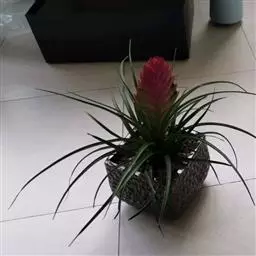 果子蔓 又名擎天凤梨、红杯凤梨、西洋凤梨,为多年生草本。叶长带状,浅绿色,背面微红,薄而光亮。穗状花序高出叶丛,花茎、苞片和基部的数枚叶片呈鲜红色。果子蔓叶片翠绿,光亮,深红色管状苞片,色彩艳丽持久,是目前世界花卉市场十分流行的盆栽花卉之一。果子蔓为花叶兼用之室内盆栽花卉,还可作切花用。既可观叶又可观花,适宜在明亮的室内窗边长年欣赏。