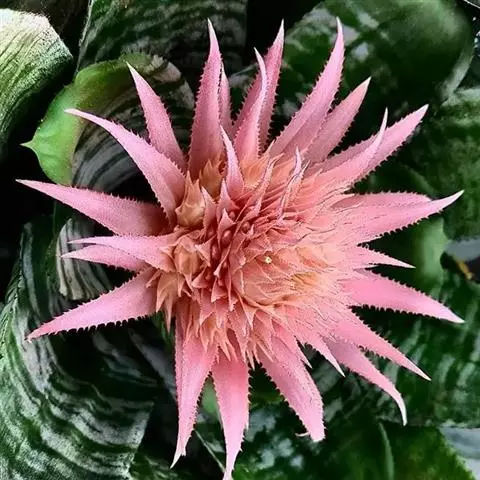 美叶光萼荷是凤梨科光萼荷属的多年生附生常绿草本植物。叶基生,莲座状叶丛基部围成筒状,…