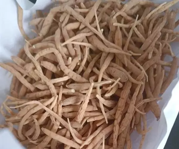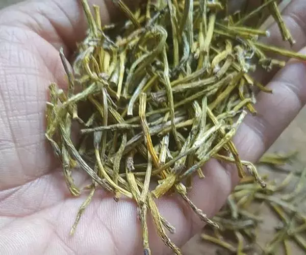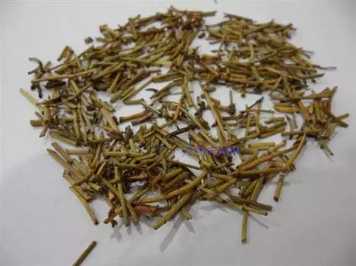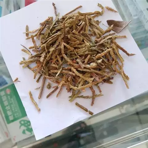 药材来源为麻黄科草麻黄的干燥草质茎。秋季采割绿色草质茎,晒干。呈细长圆柱形,少分枝,直径1-2mm,有的带少量质茎。表面淡绿至黄绿色,有细的纵棱线,触之微有粗糙感。节明显,节间长2-6cm,节上有膜质鳞叶,鳞叶2,稀3,锐三角形,长3-4mm,先端反曲,基部常连合成筒状。质较脆,易折断,折断时有粉尘飞出,断面略呈纤维性,周边绿黄色,髓部红棕色,近圆形。气微香,味微苦涩。