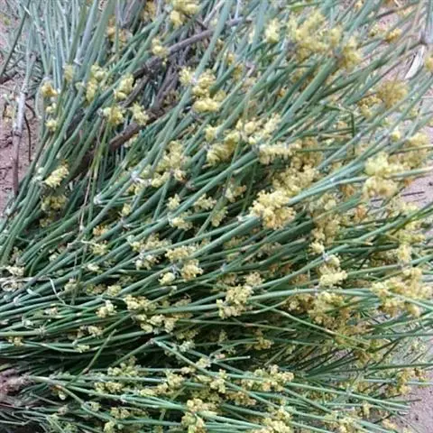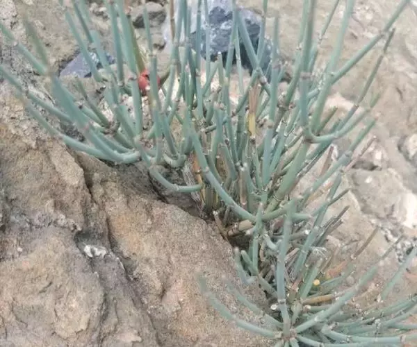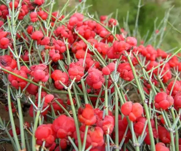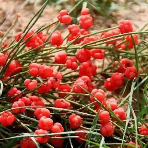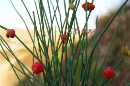 草本状灌木,高20-40厘米;木质茎短或成匍匐状,小枝直伸或微曲,表面细纵槽纹常不明显,节间长2.5-5.5厘米,多为3-4厘米,径约2毫米。叶2裂,鞘占全长1/3-2/3,裂片锐三角形,先端急尖。雄球花多成复穗状,常具总梗,苞片通常4对,雄蕊7-8,花丝合生,稀先端稍分离;雌球花单生,在幼枝上顶生,在老枝上腋生,常在成熟过程中基部有梗抽出,使雌球花呈侧枝顶生状,卵圆形或矩圆状卵圆形,苞片4对,下部3对合生部分占1/4-1/3,最上一对合生部分达1/2以上;雌花2,胚珠的珠被管长1毫米或稍长,直立或先端微弯,管口隙裂窄长,约占全长的1/4-1/2,裂口边缘不整齐,常被少数毛茸。雌球花成熟时肉质红色,矩圆状卵圆形或近于圆球形,长约8毫米,径6-7毫米;种子通常2粒,包于苞片内,不露出或与苞片等长,黑红色或、灰褐色,三角状卵圆形或宽卵圆形,长5-6毫米,径2.5-3.5毫米,表面具细皱纹,种脐明显,半圆形。花期5-6月,种子8-9月成熟。