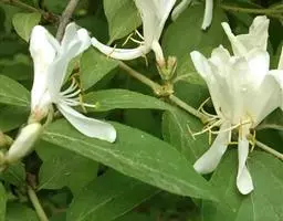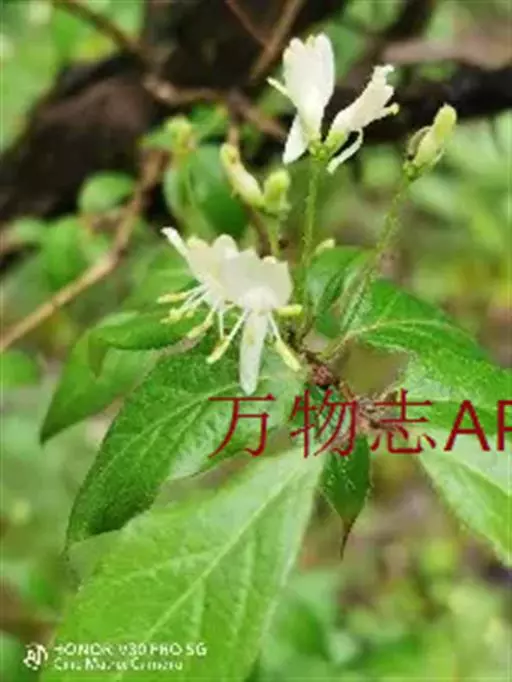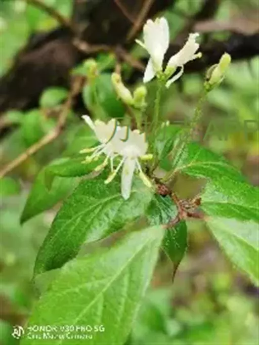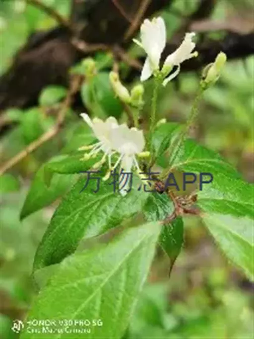 金花忍冬 落叶灌木,高达4米;幼枝、叶柄和总花梗常被开展的直糙毛、微糙毛和腺。冬芽卵状披针形,鳞片5-6对,外面疏生柔毛,有白色长睫毛。叶纸质,菱状卵形、菱状披针形、倒卵形或卵状披针形,长4-8(-12)厘米,顶端渐尖或急尾尖,基部楔形至圆形,两面脉上被直或稍弯的糙伏毛,中脉毛较密,有直缘毛;叶柄长4-7毫米。
