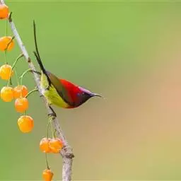 • 红腰朱雀:体长12-14厘米,小型鸟类。雄鸟前额和眉纹玫瑰粉红色,头顶和一宽的贯眼带深红褐色,背红…