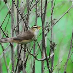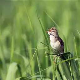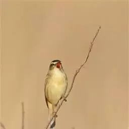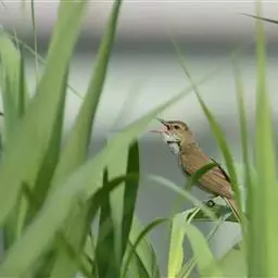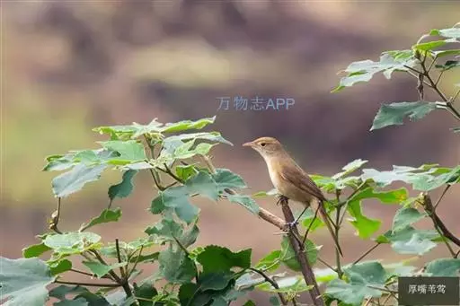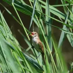 厚嘴苇莺(学名:Arundinax aedon):额羽松散,羽干伸延;嘴宽阔,基部宽度超过4毫米;嘴须非常发达,具副须;尾羽12枚,尾羽凸状甚著;上体羽橄榄棕褐色;下体羽近白色,微沾淡棕色。虹膜暗褐色;嘴黑褐色,下嘴基部淡黄褐色;脚暗铅褐色。