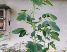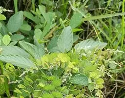 多年生直立草本,高60-120厘米。常由基部开始分枝,技较纤细,上部略被灰色柔毛。叶通常为单小叶,稀有3小叶;托叶刺毛状,长5-6毫米,脱落;叶柄长2-2.5厘米,被稀疏短柔毛;小叶近革质,灰绿色,顶生小叶菱形或长菱形或元宝形,长0.8-1.5厘米,宽5-9厘米,先端宽而截平,近中央处稍凹,基部略呈心形,侧生小叶倒心形或倒三角形,两侧常不对称,长8-15毫米,宽15-20毫米,先端截平,基部楔形或近圆形,上面无毛,下面稍被短柔毛,侧脉每边3-4条,平展,网脉在下面不明显;小叶柄长1毫米。