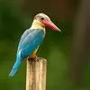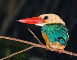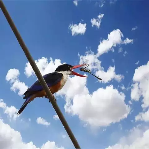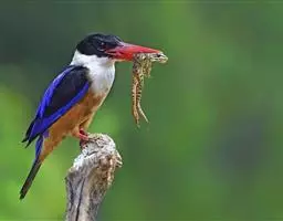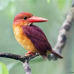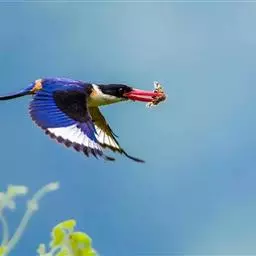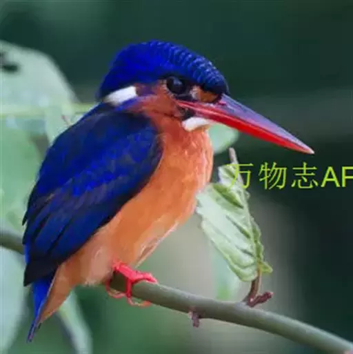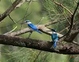 蓝翠鸟(学名:Ceyx azureus):体长17-19厘米,翼展25-29厘米,体重40克。体羽艳丽而具光辉,头、背羽蓝色有光泽,胸腹部是美丽明亮的桔红色或红棕色,翅膀上夹有一些黑色,后颈和喉部有白斑,尾下尖部是斑驳的灰黑色,腿和脚是鲜红色。嘴粗直,长而坚。食物以小鱼为主,兼吃甲壳类和多种水生昆虫及其幼虫,也啄食小型蛙类和少量水生植物。