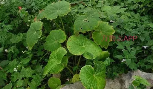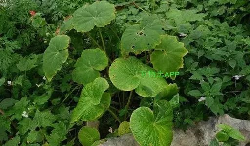基生叶1,和茎生叶同形,均具长柄。叶片两侧不相等,轮廓卵状长圆形,长12-14厘米,宽11-13厘米,先端尾状渐尖,基部深心形,窄侧圆形,宽侧向下延伸达2-4厘米,呈圆耳状,边缘有不等短三角形之齿,齿尖常带芒,并常有浅裂,裂片宽三角形,先端急尖,上面深绿色或褐绿色,近无毛或散生极短硬毛,下面淡绿色,近无毛,掌状6条脉,窄侧2条,宽侧4条,侧脉明显;叶柄长17-27厘米,有棱,近无毛;托叶早落。花葶高13-20厘米,有棱,无毛。