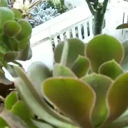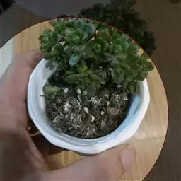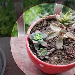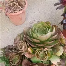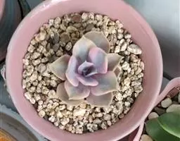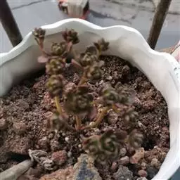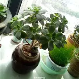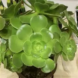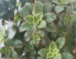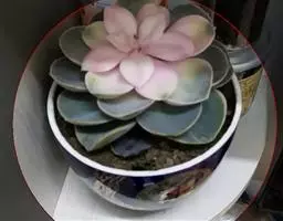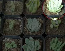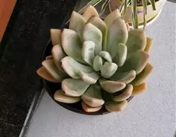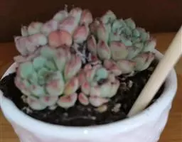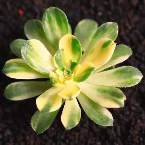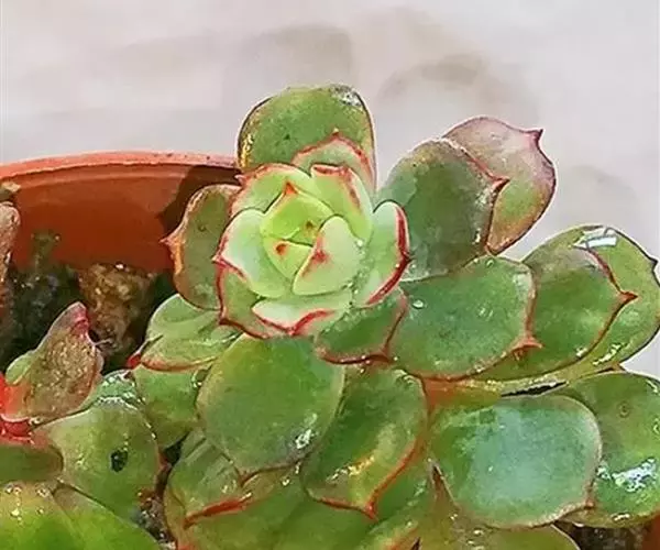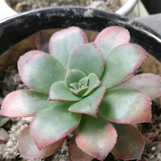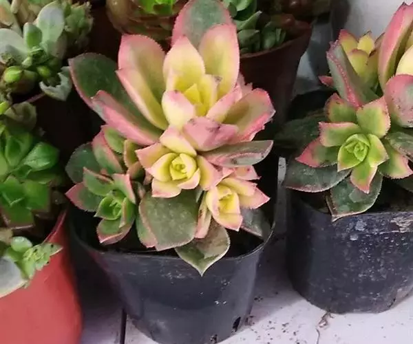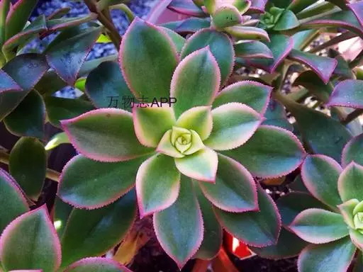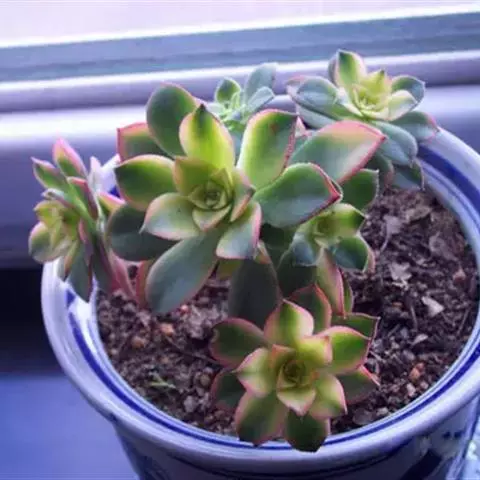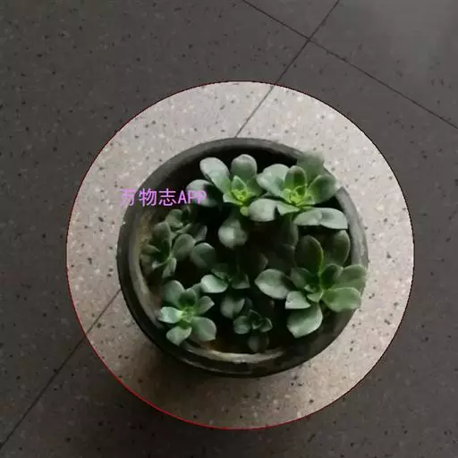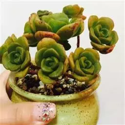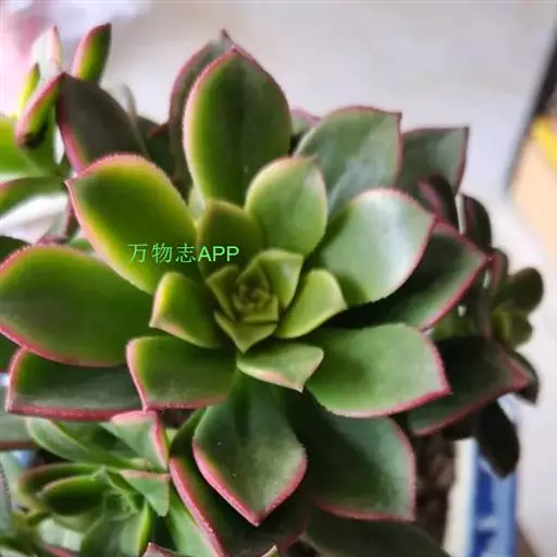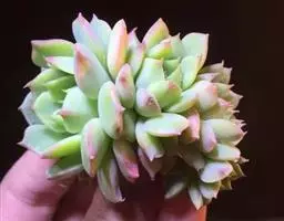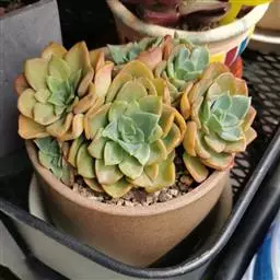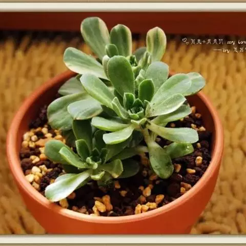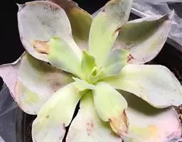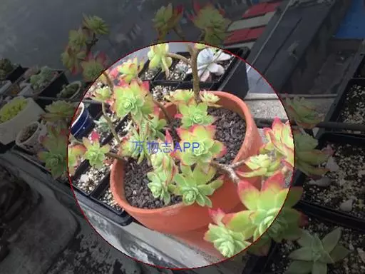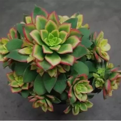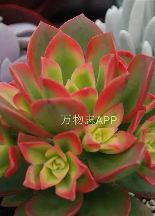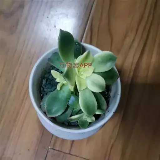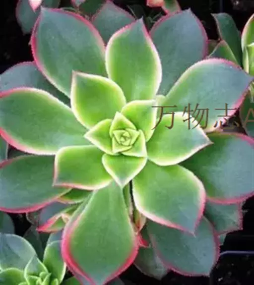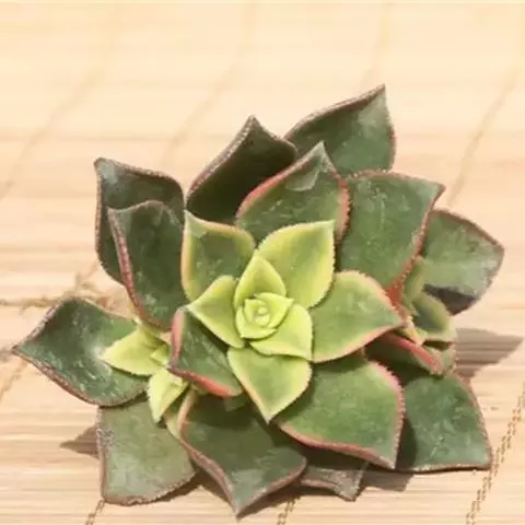 夕映 叶多肉,成基生叶丛,呈莲座状,叶片为扁平卵形,新生叶片总体为淡黄色,中心淡绿色,老叶黄色减少。夏季几乎完全为深绿色,秋冬季节绿色减淡,锦斑会变得较为模糊,充足光线下边缘会呈现橘红色至桃红色,成株直径约10-15厘米。极易产生分株,摘下分株晾干数日后扦插,即可成为新株。