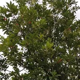 山杜英(学名:Elaeocarpus sylvestris (Lour.) Poir.):杜英科,杜英属小乔木,高可达10米;小枝纤细,秃净无毛;叶纸质,倒卵形或倒披针形,上下两面均无毛,边缘有钝锯齿或波状钝齿;叶柄无毛。总状花序生于枝顶叶腋内,花序轴、花柄,纤细,萼片披针形,花瓣倒卵形,花药有微毛,花盘圆球形,被白色毛;子房被毛,核果椭圆形细小,内果皮薄骨质,4-5月开花。8-10月结果。