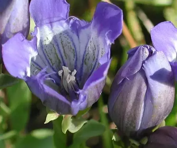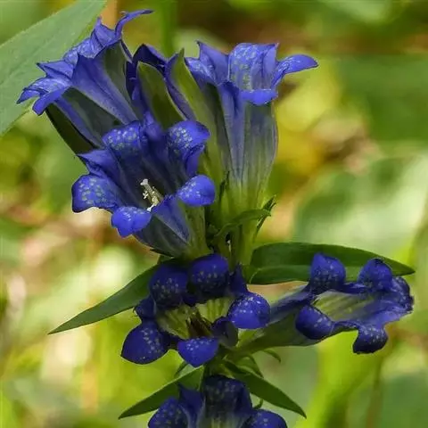 花单生枝顶,基部包围于上部茎生叶丛中,5数,稀6数;无花梗;花萼筒紫红色或黄绿色,长6-8毫米,裂片绿色,叶状,与上部茎生叶同形,长4-4.5毫米,弯缺狭,截形;花冠蓝色,具深蓝色条纹,狭漏斗形,长3.5-5厘米,喉部直径1.3-1.7厘米,裂片宽三角形,长2-3毫米,先端钝,具长1-2毫米的尾尖,全缘,褶整齐,截形或宽卵形,长1-1.5毫米,先端钝圆,边缘齿蚀形;雄蕊着生于冠筒下部,整齐,花丝钻形,长8-10毫米,下部突然加宽,基部向冠筒下延成翅,花药狭椭圆形,长2-2.5毫米;子房狭椭圆形,长9-11毫米,两端渐狭,柄长11-15毫米,花柱丝状,连柱头长6-7毫米,柱头2裂,裂片外卷,线形。