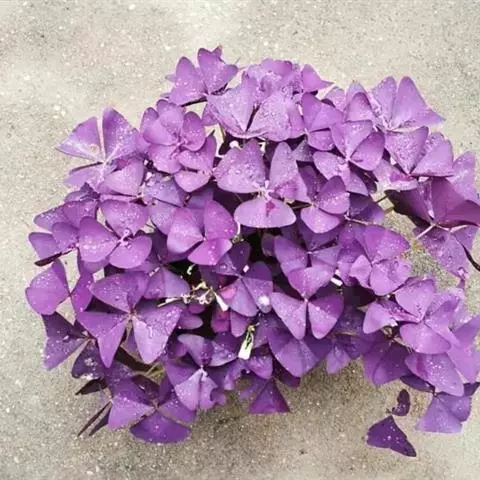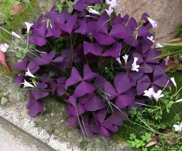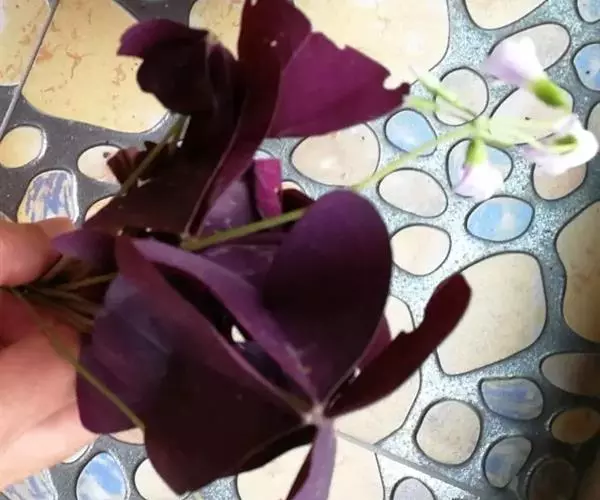多年生草本,地下块茎粗大。叶丛生,具长柄,掌状复叶,小叶 3枚,无柄,倒三角形,深紫色。紫叶酢浆草植株整齐,叶色紫红,紫红色叶片美丽诱人,粉红色花朵烂漫可爱。有些叶片上有黑色斑点分布,又称斑叶。