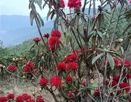 黄杯杜鹃(学名:Rhododendron wardii W. W. Smith):灌木,高约3米;幼枝嫩绿色,平滑无毛,老枝灰白色,树皮有时层状剥落。叶多密生于枝端,革质,长圆状椭圆形或卵状椭圆形,上面深绿色,下面淡绿色或灰绿色。总状伞形花序,有花5-14朵;花冠杯状,长3-4厘米,直径4-5厘米,鲜黄色,5裂,裂片近圆形。蒴果圆柱状,微弯曲,顶端渐尖成锥状,被腺毛。花期6-7月,果期8-9月。