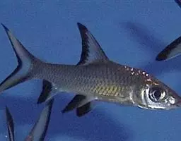 吻稍尖。口下位,呈马蹄形。口角须1对。背部灰黑 色,体侧浅黄色,体背有一条较细的黑色纹带,体侧中轴也有一条黑色纹带。尾鳍叉型。