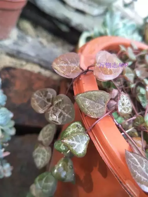 叶对生,长1-1.5厘米,宽约1.5厘米,沿匍匐茎排列,每隔约8厘米有一对。叶肥厚肉质,呈心形,叶柄较短。叶深绿色,叶面上有灰、白色网状花纹,叶背呈紫红色;
